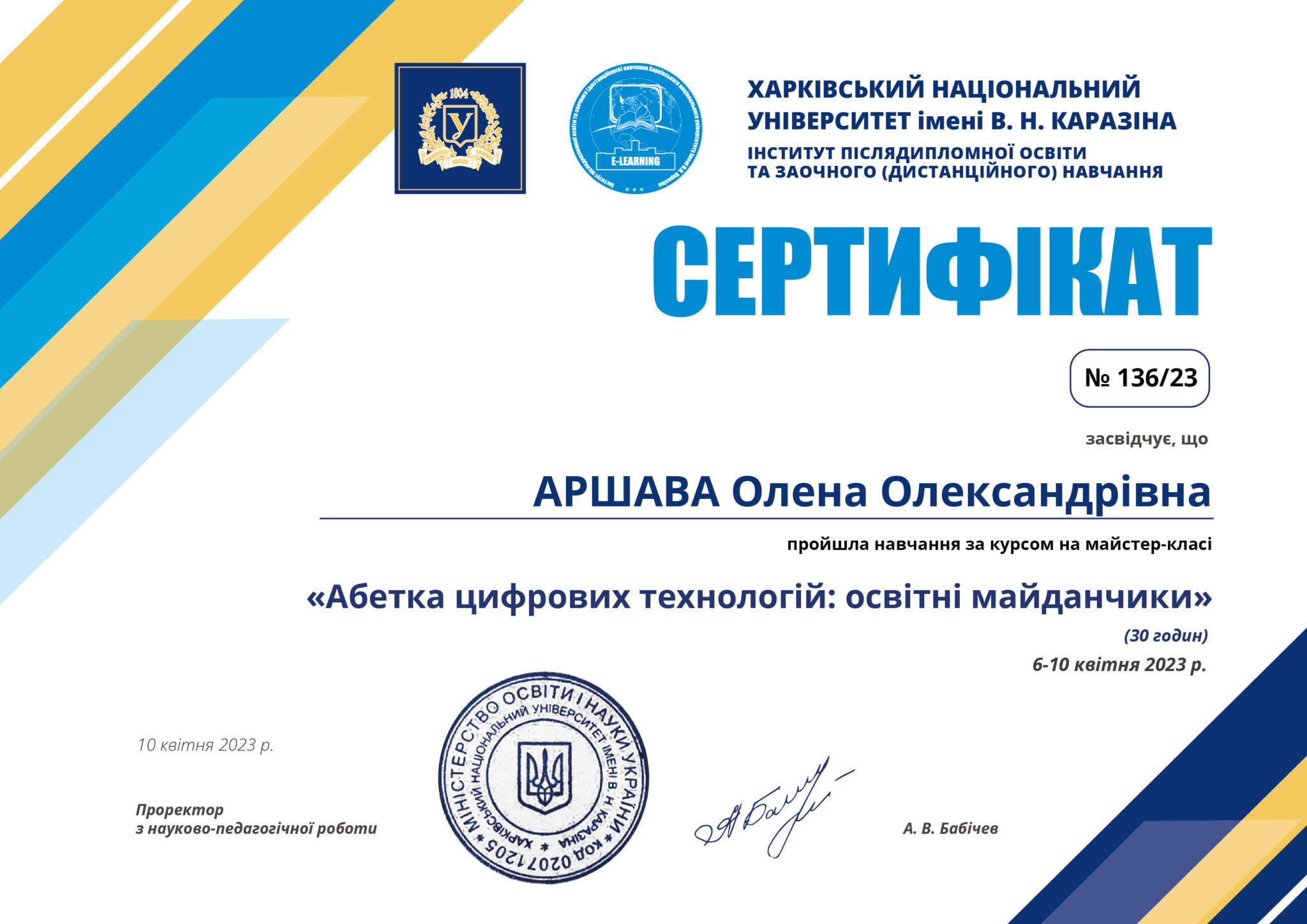 - Сертифікат учасника курсу-мастер-класу «Абетка цифрових технологій: освітні майданчики» (Харківський національний університет імені В. Н. Каразіна, 6–10 квітня 2023)