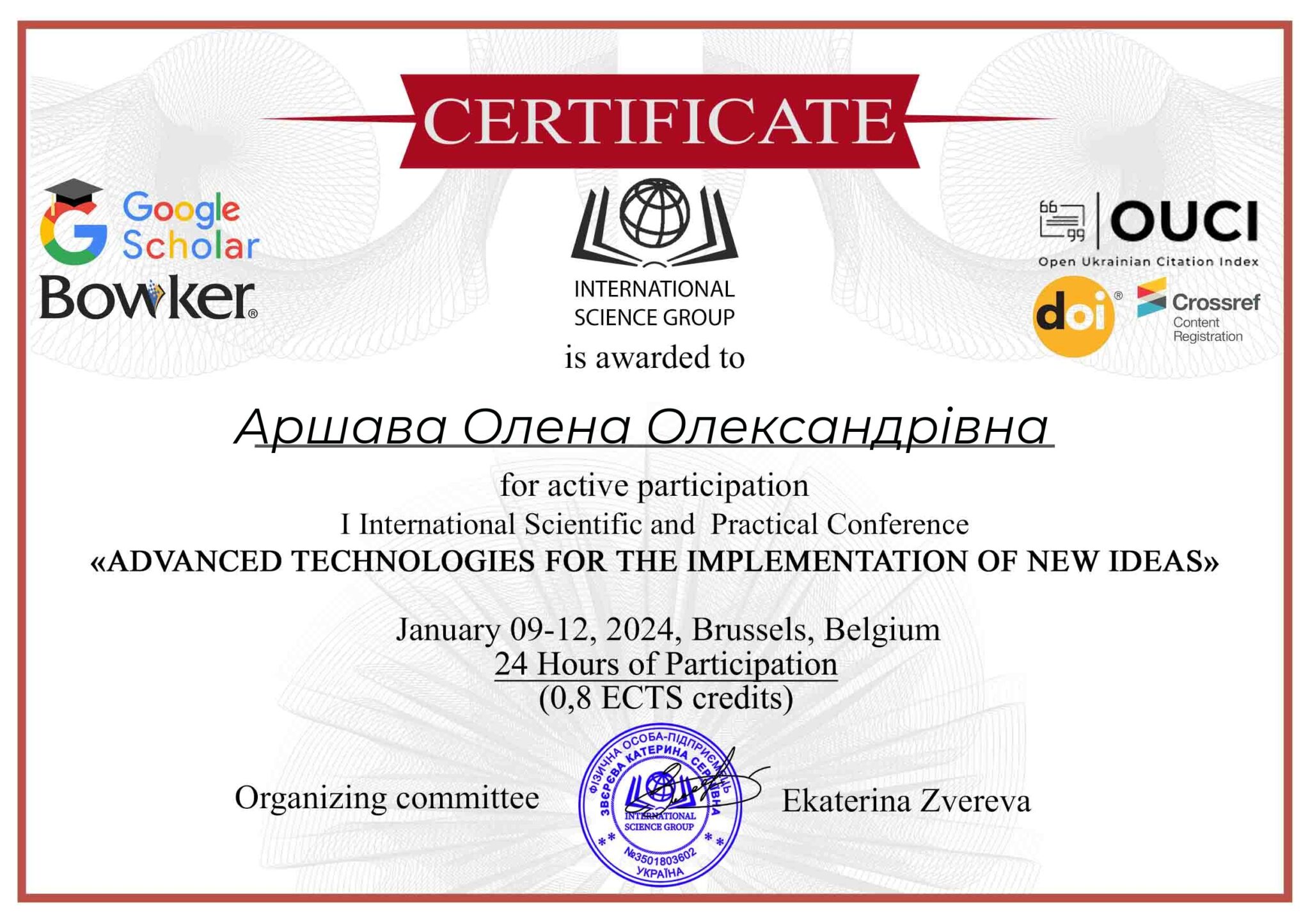 - Сертифікат учасника I Міжнародної науково-практичної конференції «Advanced Technologies for the Implementation of New Ideas» (Брюссель, 9–12 січня 2024)
