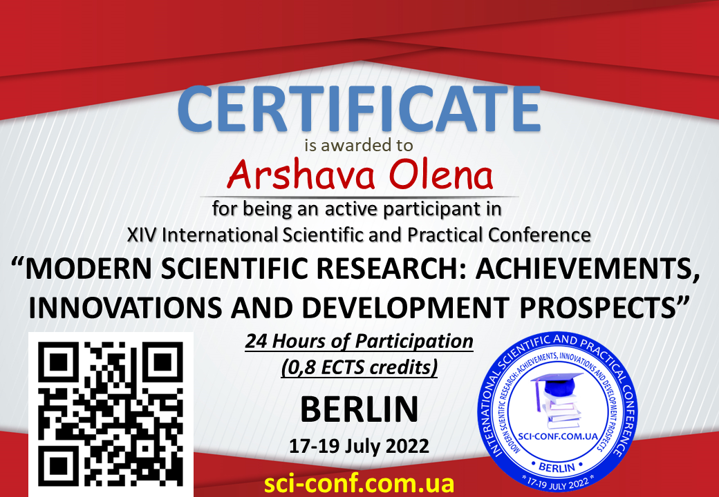 - Сертифікат учасника XIV Міжнародної науково-практичної конференції «Modern Scientific Research: Achievements, Innovations and Development Prospects» (Берлін, 17–19 липня 2022)