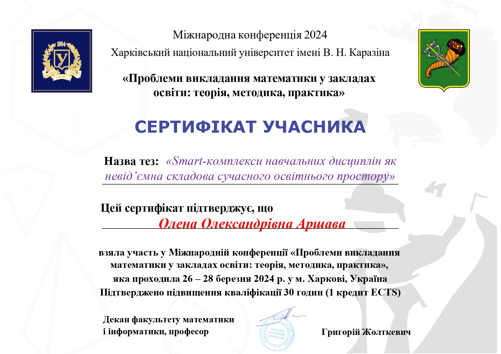 - Сертифікат учасника Міжнародної конференції «Проблеми викладання математики у закладах освіти: теорія, методика, практика» (Харків, 26–28 березня 2024)