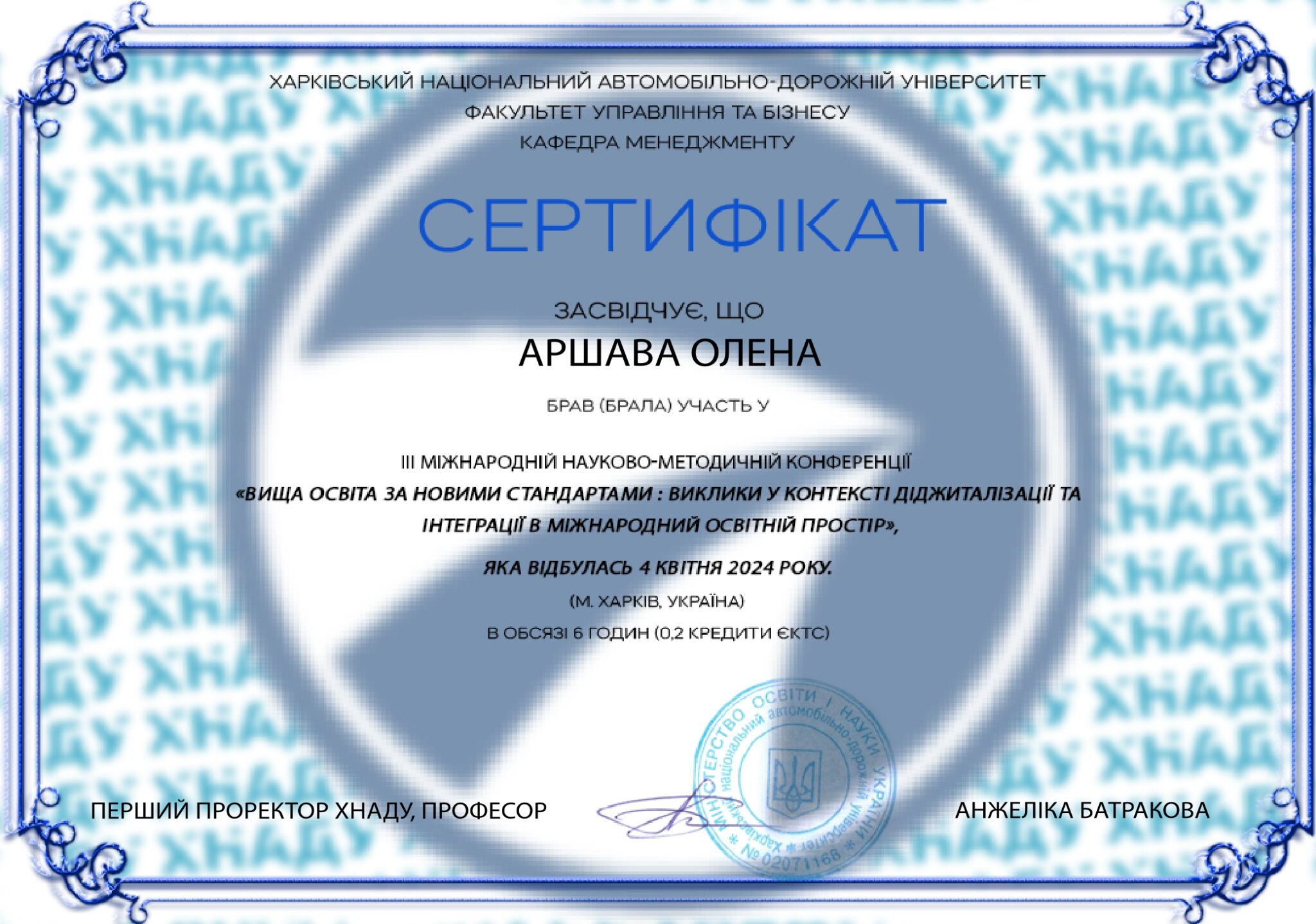 - Сертифікат учасника III Міжнародної науково-методичної конференції «Вища освіта за новими стандартами: виклики у контексті діджиталізації та інтеграції в міжнародний освітній простір» (Харків, 4 квітня 2024)