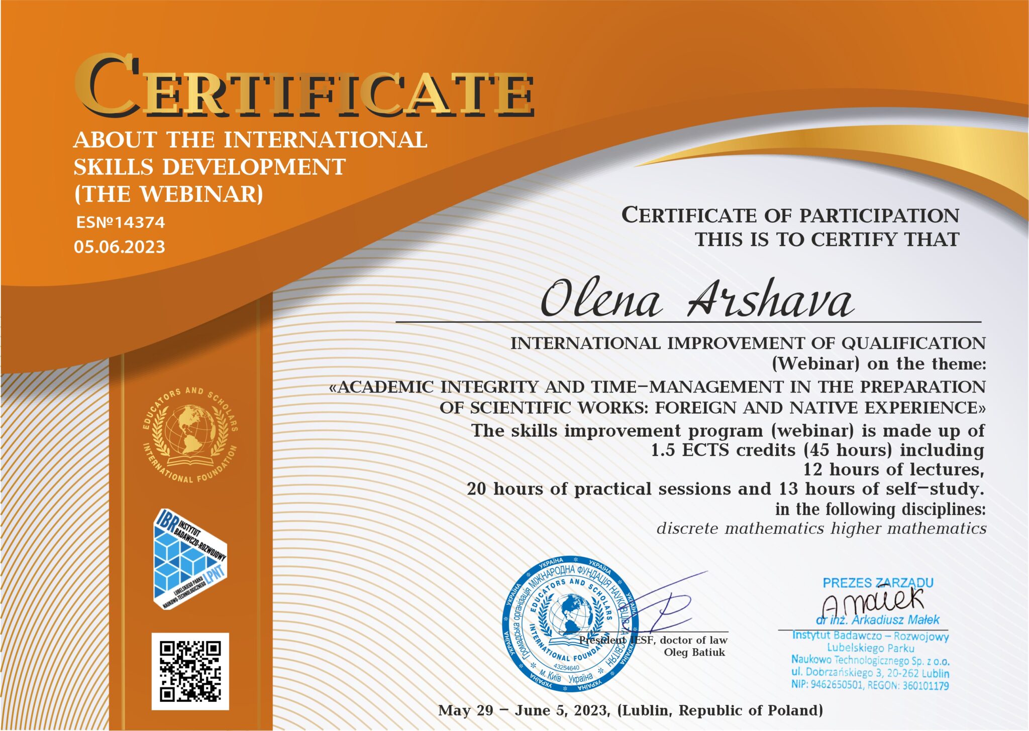 - Сертифікат учасника міжнародного вебінару «Academic Integrity and Time-Management in the Preparation of Scientific Works: Foreign and Native Experience» (Люблін, Польща, 29 травня – 5 червня 2023)