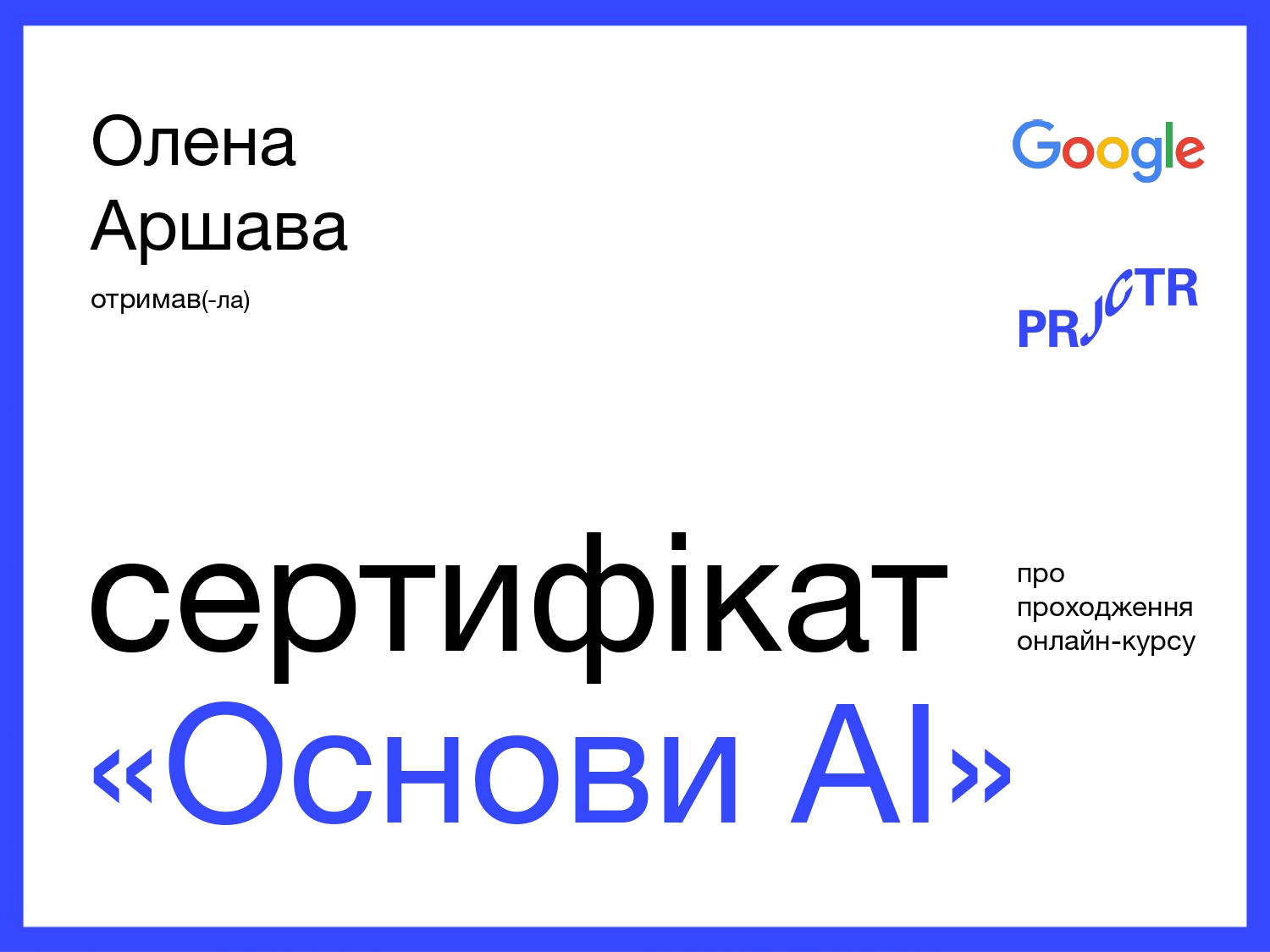 - Сертифікат учасника онлайн-курсу «Основи AI» (Google, Projector, 2024)