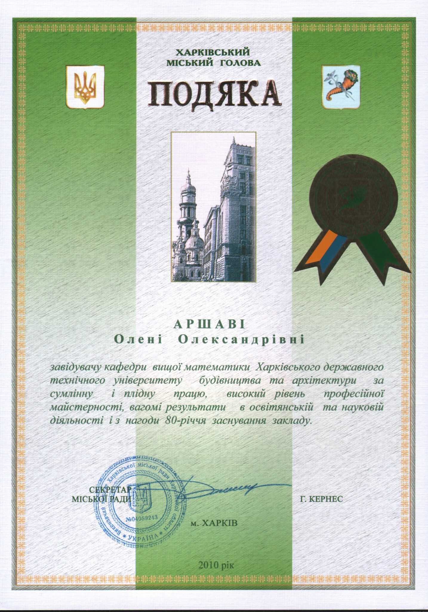 - 2010 р – Подяка міського голови за сумлінну та плідну працю, високий рівень професійної майстерності, вагомі результати в освітянській та науковій діяльності і з нагоди 80-річчя заснування ХДТУБА.