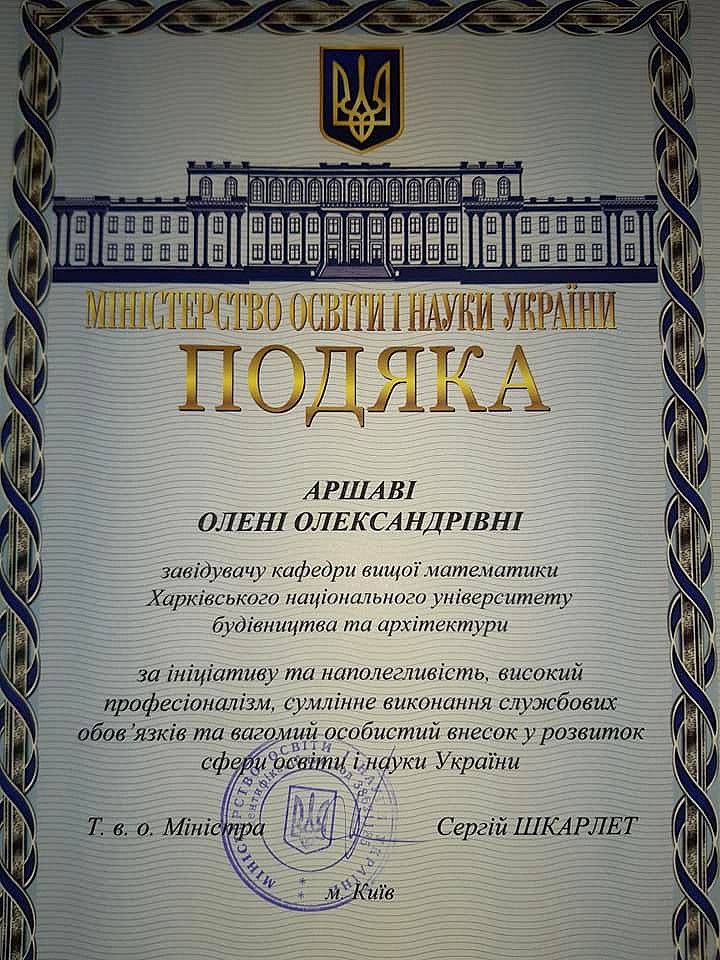 - 2020 р – Подяка Міністерства освіти і науки України за ініціативу та наполегливість, високий професіоналізм, сумлінне виконання службових обов’язків та вагомий особистий внесок у розвиток сфери освіти і науки України (Наказ МОН України №399-к від 02.11.2020).