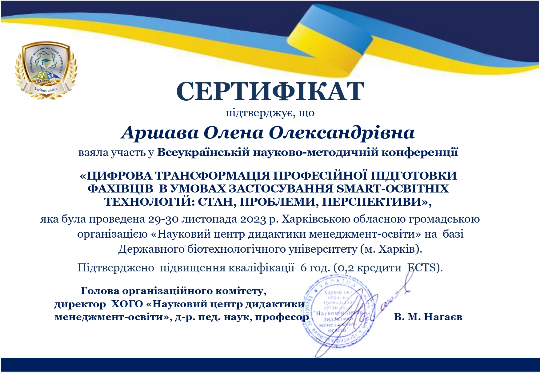 - Сертифікат учасника Всеукраїнської науково-методичної конференції «Цифрова трансформація професійної підготовки фахівців в умовах застосування SMART-освітніх технологій» (Харків, 29–30 листопада 2023)
