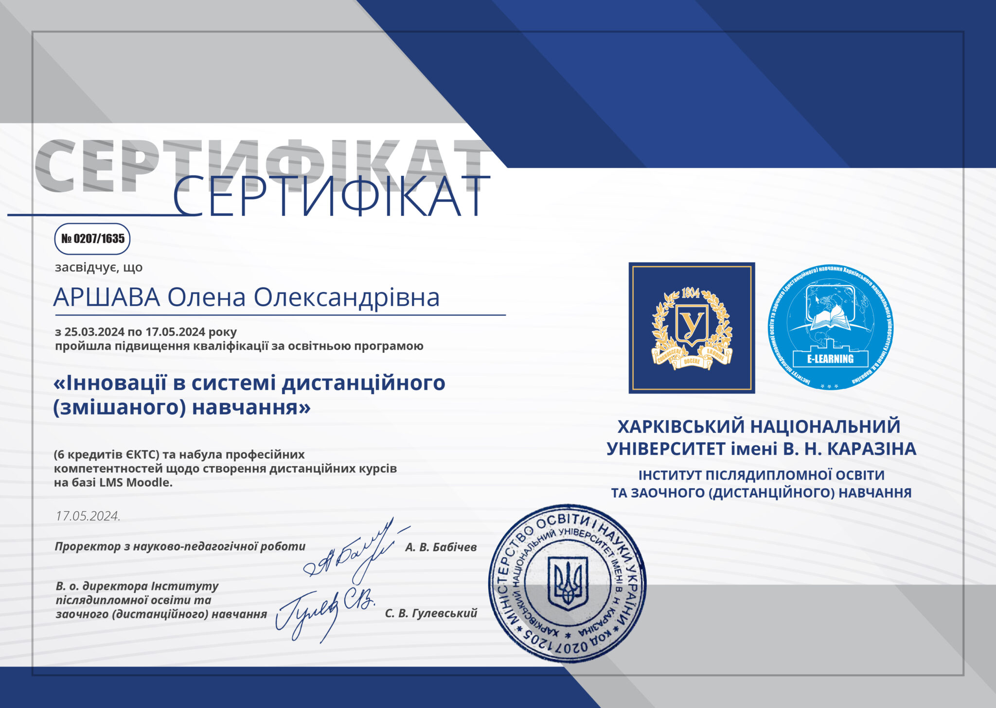 - Харківський національний університет імені В.Н. Каразіна Сертифікат № 0207/1635. Дата видачі: 17.05.2024. Кількість навчальних кредитів (годин): 180 годин Тема: Інновації в системі дистанційного (змішаного) навчання прикріпити лінк на сертифікат