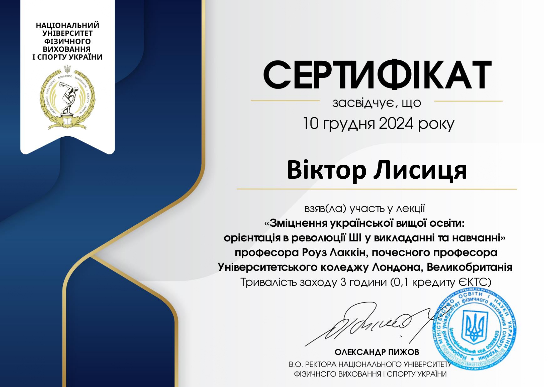 - Сертифікат учасника лекції Національного університету фізичного виховання і спорту України «Зміцнення української вищої освіти: орієнтація в революції ШІ у викладанні та навчанні» (10 грудня 2024)